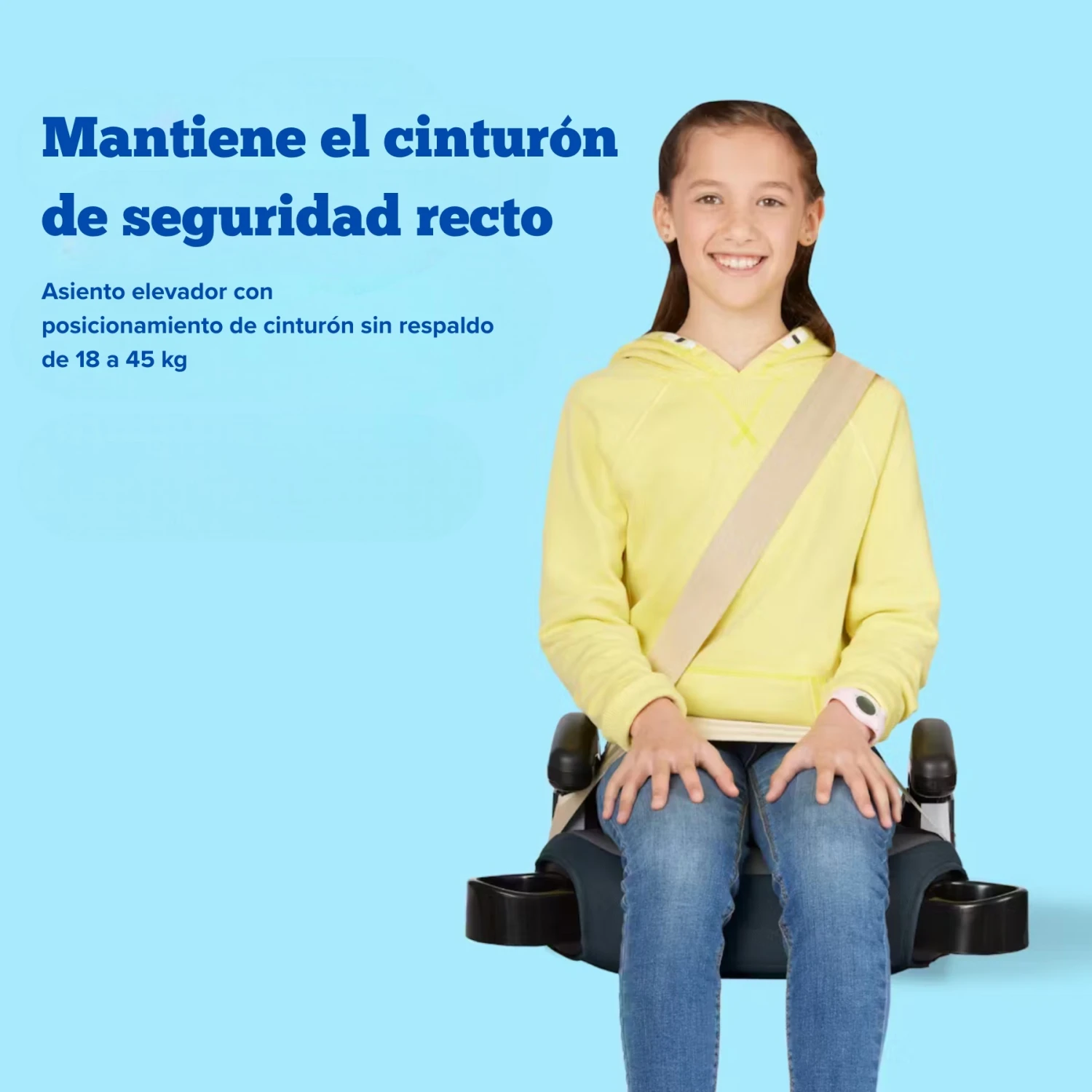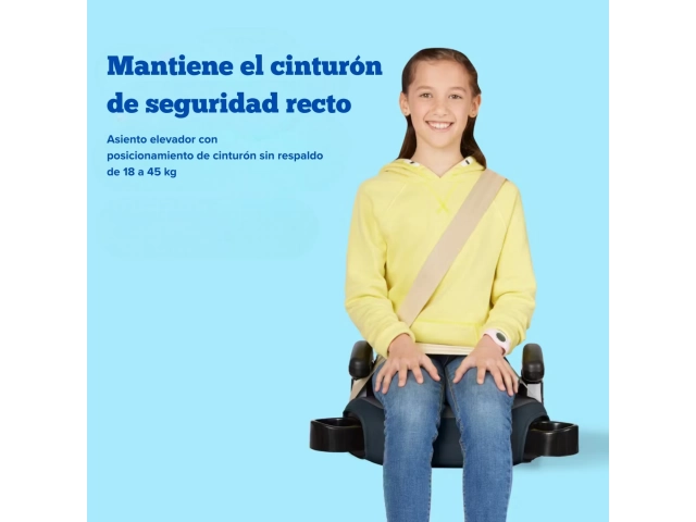 Ayuda a transportar de forma segura y cómoda a niños grandes de 4 a 10 años, con un peso de 18 a 45 kg y hasta 1,50 m de altura. Este asiento elevador sin respaldo eleva al niño a la altura adecuada para el correcto uso del cinturón de seguridad del vehículo.