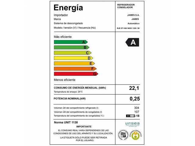 JAMES REFRIGERADOR INVERTER RJE 571 INOX FRIO SECO
