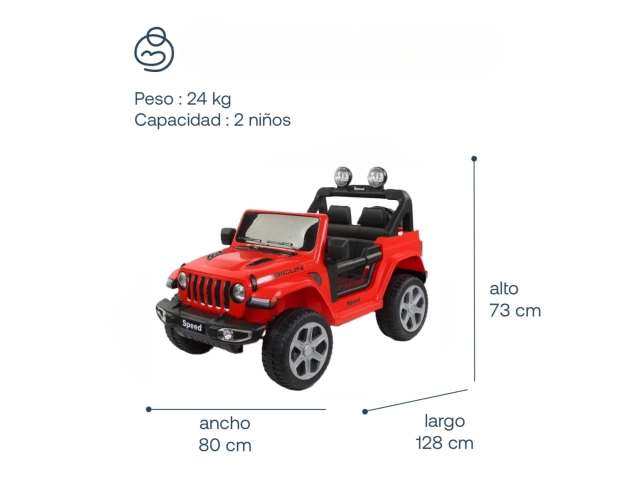 Incluye luces LED, puertas abatibles, suspensión en las cuatro ruedas, y un tablero musical con MP3 y USB, que suman entretenimiento en cada recorrido. Además, incorpora control remoto 2.4G Bluetooth, permitiendo a los adultos manejar el vehículo cuando sea necesario. Soporta hasta 40 kg, garantizando seguridad y durabilidad.