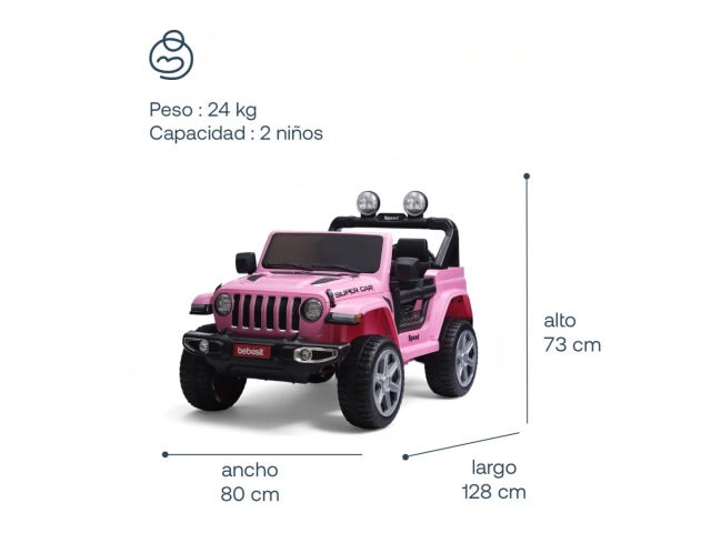 El Jeep Renegado Bebesit 12V ofrece a los niños una experiencia de manejo divertida y segura gracias a su diseño resistente y lleno de detalles. Con 4 motores 380 y una batería 12V7A, brinda buena potencia, estabilidad y una autonomía de 2 a 3 horas. Su velocidad máxima de 3 km/h lo hace ideal para paseos controlados.