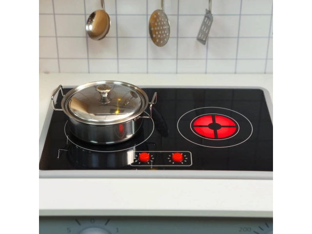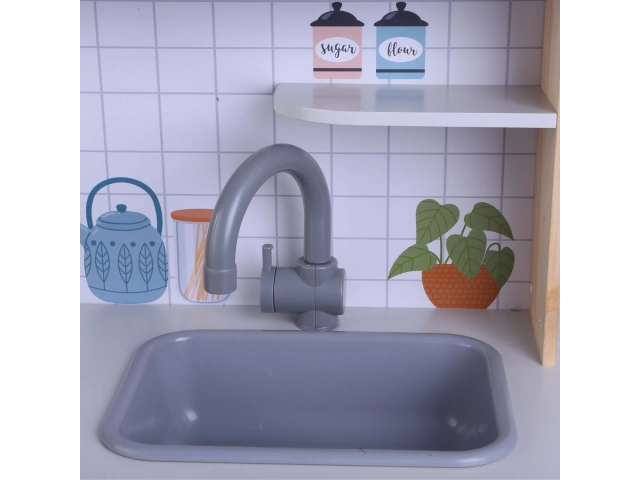 - Diseño realista e interactivo: Estufa con sonidos realistas e iluminación controlada por botones, además de horno, microondas, campana extractora, grifo, fregadero removible y una nevera de juguete.