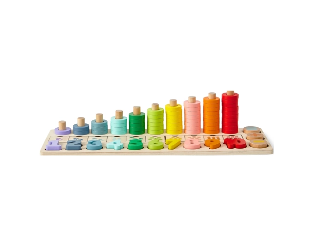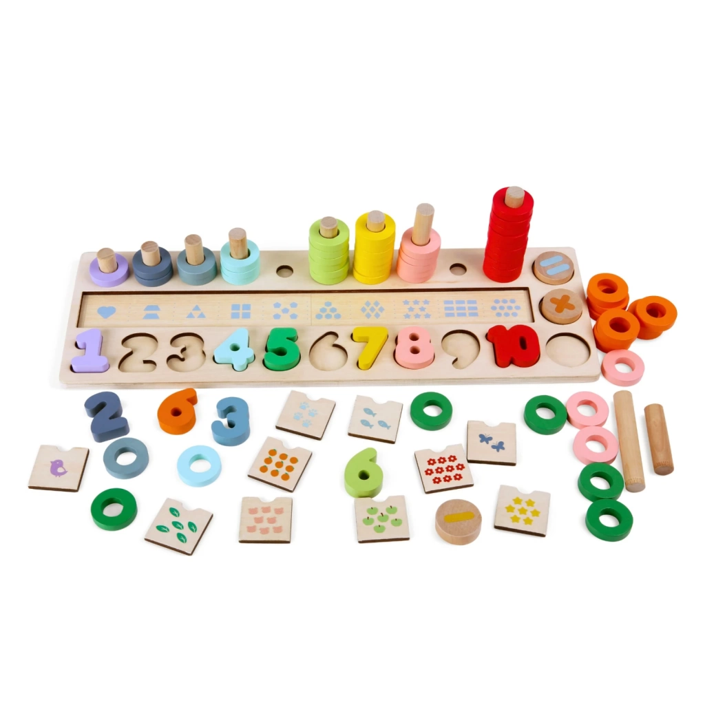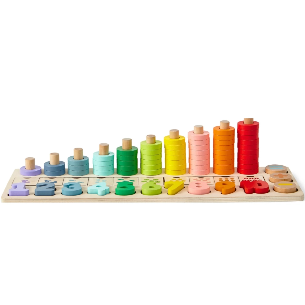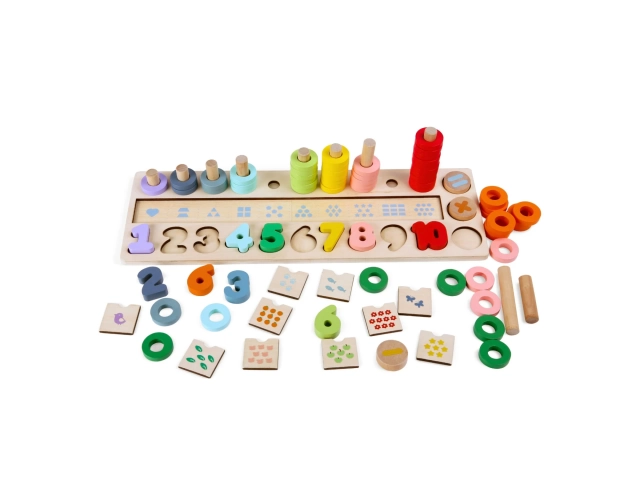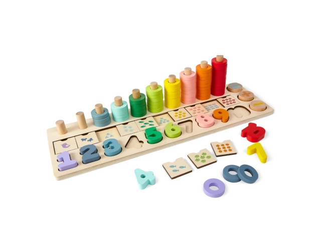 Juego educativo de madera con números y piezas encastrables, ideal para enseñar a los niños los números y mejorar sus habilidades motoras y cognitivas de forma divertida.